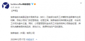 12月17日,瑞幸咖啡发布声明,称瑞幸咖啡与美国证券交易委员会(SEC)已就部分前员工涉嫌财务造假事件达成和解。目前公司和门店运营稳定、经营正常。瑞幸咖啡将持续配合监管,将合规工作视为重中之重。